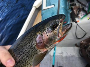 So how have I been catching them? Lately, I’ve been up in the mountains looking for lakes with good fishing opportunities. I have my little car top boat, and electric motor. You could easily row as well. My 6’7 spinning rod and reel loaded with 10lb mono. For the other tackle, I use a 1/4oz weight, a swivel, then a leader of about 18-20inches attached to my lure. The best lure working for me right now is the Gibbs Wedding Band. In the yellow & pink colour, or just plain green. Put a little piece of worm on the hook, toss it out and start trolling. Basic yet effective setup that has me constantly pulling these beautiful fish in this year.